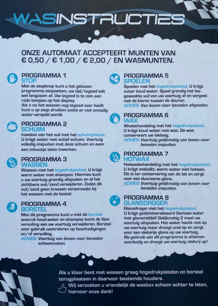 - Het gebruik van onze wasboxen is op eigen risico. Wij zijn niet aansprakelijk voor schade aan uw voertuig door gebruik van, of defect aan onze installatie alsmede door hoge druk.